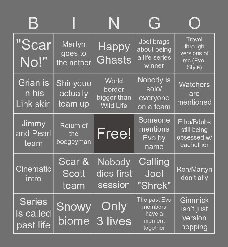 This bingo card has a free space and 24 words: Scar & Scott team, Snowy biome, World border bigger than Wild Life, Series is called past life, Travel through versions of mc (Evo-Style), "Scar No!", Grian is in his Link skin, Martyn goes to the nether, Someone mentions Evo by name, Nobody dies first session, Nobody is solo/ everyone on a team, Jimmy and Pearl team, Calling Joel "Shrek", Ren/Martyn don’t ally, Shinyduo actually team up, The past Evo members have a moment together, Etho/Bdubs still being obsessed w/ eachother, Happy Ghasts, Watchers are mentioned, Return of the boogeyman, Gimmick isn’t just version hopping, Cinematic intro, Joel brags about being a life series winner and Only 3 lives.