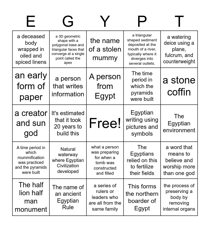 This bingo card has a free space and 24 words: Natural waterway where Egyptian Civilization developed, The name of an ancient Egyptian Rule, A person from Egypt, The half lion half man monument, a watering deice using a plane, fulcrum, and counterweight, a deceased body wrapped in oiled and spiced linens, an early form of paper, a 3D geometric shape with a polygonal base and triangular faces that converge at a single point called the apex, Egyptian writing using pictures and symbols, what a person was preparing for when a tomb was constructed and filled, The time period in which the pyramids were built, a creator and sun god, The Egyptians relied on this to fertilize their fields, a word that means to believe and worship more than one god, a person that writes information, This forms the northern boarder of Egypt, The Egyptian environment, the name of a stolen mummy, a stone coffin, It's estimated that it took 20 years to build this, the process of preserving a body by removing internal organs, A time period in which mummification was practiced and the pyramids were built, a triangular shaped sediment deposited at the mouth of a river, typically where it diverges into several outlets. and a series of rulers or leaders who are all from the same family.