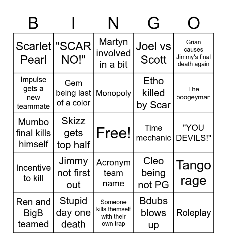 This bingo card has a free space and 24 words: Jimmy not first out, Stupid day one death, Monopoly, Ren and BigB teamed, Grian causes Jimmy's final death again, Scarlet Pearl, Impulse gets a new teammate, "SCAR NO!", Time mechanic, Acronym team name, Etho killed by Scar, Mumbo final kills himself, Cleo being not PG, Tango rage, Gem being last of a color, Bdubs blows up, "YOU DEVILS!", Martyn involved in a bit, The boogeyman, Skizz gets top half, Roleplay, Incentive to kill, Joel vs Scott and Someone kills themself with their own trap.