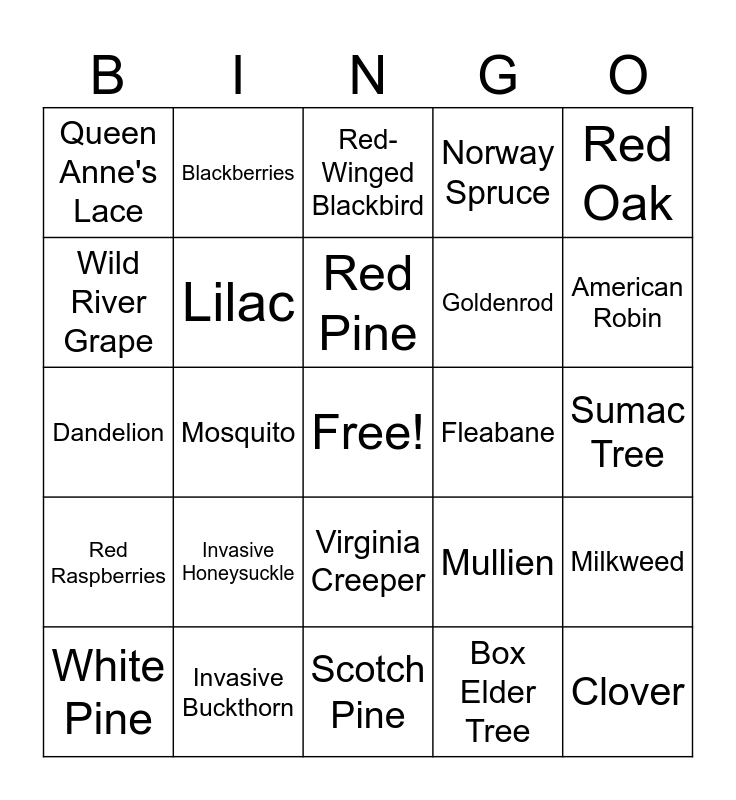 This bingo card has a free space and 24 words: Invasive Honeysuckle, Invasive Buckthorn, Red Pine, White Pine, Red Oak, Queen Anne's Lace, Wild River Grape, Blackberries, Fleabane, Virginia Creeper, Goldenrod, Dandelion, Mullien, Milkweed, Lilac, Box Elder Tree, Sumac Tree, Red-Winged Blackbird, American Robin, Mosquito, Clover, Red Raspberries, Norway Spruce and Scotch Pine.