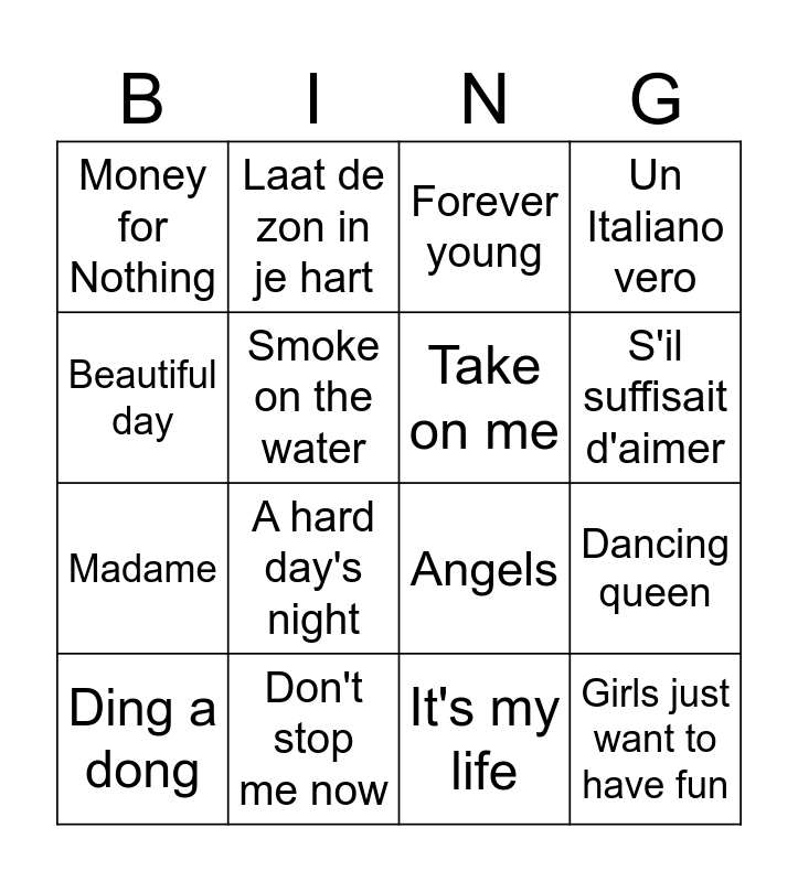 This bingo card has 16 words: Don't stop me now, Dancing queen, Forever young, Money for Nothing, Madame, Laat de zon in je hart, Angels, It's my life, Beautiful day, Smoke on the water, Ding a dong, Un Italiano vero, A hard day's night, S'il suffisait d'aimer, Take on me and Girls just want to have fun.