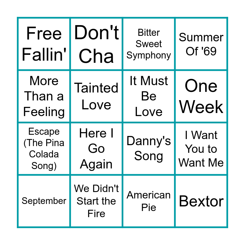 This bingo card has 100 words: Mr. Brightside, Come On Eileen, American Pie, I Want It That Way, Africa, Brown Eyed Girl, Livin' On A Prayer, Sweet Caroline, Build Me Up Buttercup, You Make My Dreams (Come True), Take Me Home, Country Roads, Don't Stop Believin', Walking On Sunshine, Centerfold, Wake Me Up Before You Go, Twist And Shout, Escape (The Pina Colada Song), Sweet Home Alabama, You Can Call Me Al, Old Time Rock & Roll, It Wasn't Me, Party In The U.S.A., Bohemian Rhapsody, Ice Ice Baby, I'm Still Standing, We Didn't Start the Fire, More Than a Feeling, You Shook Me All Night Long, Faith, The Joker, I Want You to Want Me, Free Fallin', Don't You (Forget About Me), Carry on Wayward Son, Cat's in the Cradle, One Week, Where Everybody Knows Your Name (Cheers Theme), Afternoon Delight, It's The End Of The World As We Know It (And I Feel Fine), Fight For Your Right, In the Summertime, Maggie May, Danny's Song, My Heart Will Go On, Here I Go Again, Bitter Sweet Symphony, Tubthumping, How Bizarre, Whoomp! There It Is, Jump Around, It's Like That, The King of Wishful Thinking, Bye Bye Bye, Total Eclipse of the Heart, I Will Survive, Wannabe, Umbrella, Hot In Herre, Jump, Summer Of '69, Eye of the Tiger, Toxic, Thrift Shop (feat. Wanz), Love Yourself, Hey Ya!, I Try, In The Air Tonight, Don't Dream It's Over, Easy Lover, Torn, I Wanna Dance with Somebody (Who Loves Me), Lean on Me, Dancing In the Dark, You Can't Hurry Love, I'm a Believer, Never Gonna Give You Up, Take On Me, Tainted Love, Wonderwall, Shape of You, Shake It Off, September, Show Me Love, Mamma Mia, Rock DJ, Don't Cha, Crazy In Love, Spinning Around, Whenever, Wherever, Bextor, Where Is The Love?, You're Beautiful, Dreams, Like a Prayer, It Must Be Love, Call on Me, 52's, I Love It (feat., Believe and Push It.