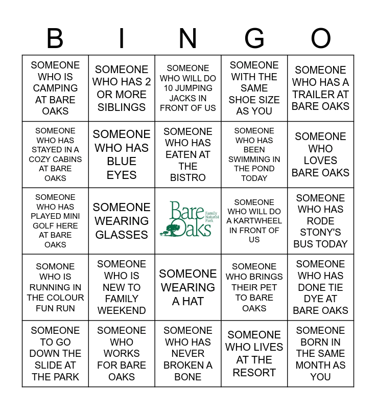 This bingo card has a free space and 24 words: SOMEONE WHO IS NEW TO FAMILY WEEKEND, SOMEONE WHO WORKS FOR BARE OAKS, SOMEONE WHO HAS EATEN AT THE BISTRO, SOMEONE TO GO DOWN THE SLIDE AT THE PARK, SOMEONE WHO HAS A TRAILER AT BARE OAKS, SOMEONE WHO IS CAMPING AT BARE OAKS, SOMEONE WHO HAS STAYED IN A COZY CABINS AT BARE OAKS, SOMEONE WHO HAS 2 OR MORE SIBLINGS, SOMEONE WHO WILL DO A KARTWHEEL IN FRONT OF US, SOMEONE WEARING A HAT, SOMEONE WHO HAS BEEN SWIMMING IN THE POND TODAY, SOMEONE WHO HAS PLAYED MINI GOLF HERE AT BARE OAKS, SOMEONE WHO BRINGS THEIR PET TO BARE OAKS, SOMEONE WHO HAS DONE TIE DYE AT BARE OAKS, SOMEONE WHO HAS BLUE EYES, SOMEONE WHO LIVES AT THE RESORT, SOMEONE WHO HAS RODE STONY'S BUS TODAY, SOMEONE WHO WILL DO 10 JUMPING JACKS IN FRONT OF US, SOMEONE WHO LOVES BARE OAKS, SOMEONE WEARING GLASSES, SOMEONE BORN IN THE SAME MONTH AS YOU, SOMONE WHO IS RUNNING IN THE COLOUR FUN RUN, SOMEONE WITH THE SAME SHOE SIZE AS YOU and SOMEONE WHO HAS NEVER BROKEN A BONE.