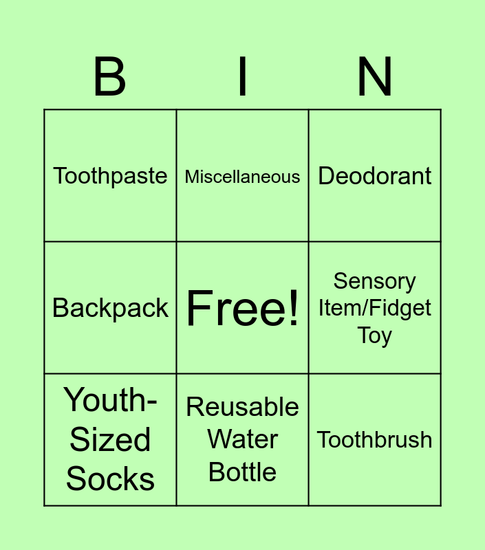 This bingo card has a free space and 8 words: Backpack, Miscellaneous, Sensory Item/Fidget Toy, Youth-Sized Socks, Deodorant, Toothpaste, Reusable Water Bottle and Toothbrush.