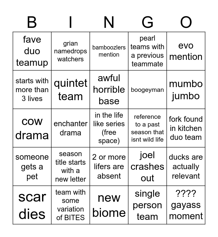 This bingo card has a free space and 24 words: season title starts with a new letter, team with some variation of BITES, awful horrible base, scar dies, evo mention, fave duo teamup, starts with more than 3 lives, grian namedrops watchers, reference to a past season that isnt wild life, 2 or more lifers are absent, boogeyman, cow drama, joel crashes out, ducks are actually relevant, quintet team, single person team, fork found in kitchen duo team, bamboozlers mention, mumbo jumbo, enchanter drama, ???? gayass moment, someone gets a pet, pearl teams with a previous teammate and new biome.