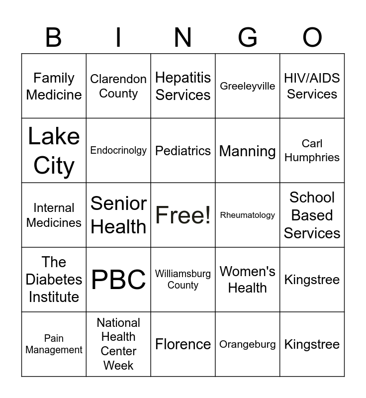 This bingo card has a free space and 33 words: Chronic Disease Management, Florence County, Senior Health, Infectious Disease, The Diabetes Institute, Endocrinolgy, HIV/AIDS Services, Pain Management, Clarendon County, Behavioral Health Services, Pediatrics, Hepatitis Services, Pharmacy, Substance Use Disorder, Rheumatology, Carl Humphries, National Health Center Week, Internal Medicines, PBC, Women's Health, Williamsburg County, Radiology, Family Medicine, School Based Services, Florence, Kingstree, Greeleyville, Manning, Lake City, Kingstree, Hemingway, Orangeburg and Aiken.