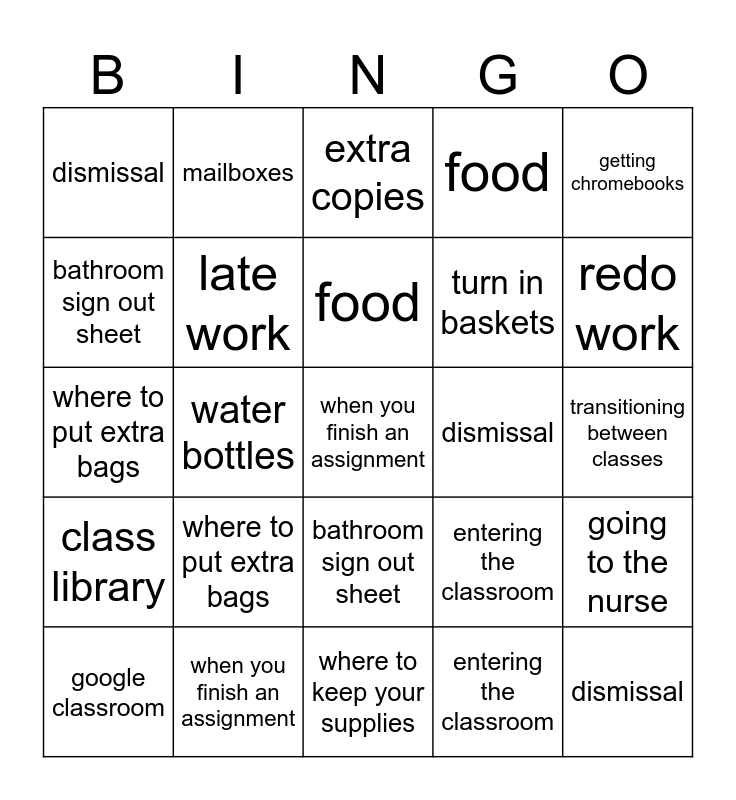 ⚠ This card has duplicate items: bathroom sign out sheet (4), pencils (4), getting chromebooks (4), entering the classroom (4), where to keep your supplies (4), using chromebooks (4), google classroom (4), turn in baskets (4), going to the nurse (4), water bottles (4), when you finish an assignment (4), goguardian (4), listening to music (4), how to end each class (4), dismissal (4), class library (4), food (4), where to put extra bags (4), transitioning between classes (4), student supply cart (4), mailboxes (4), extra copies (4), missing work (4), late work (4), redo work (4)