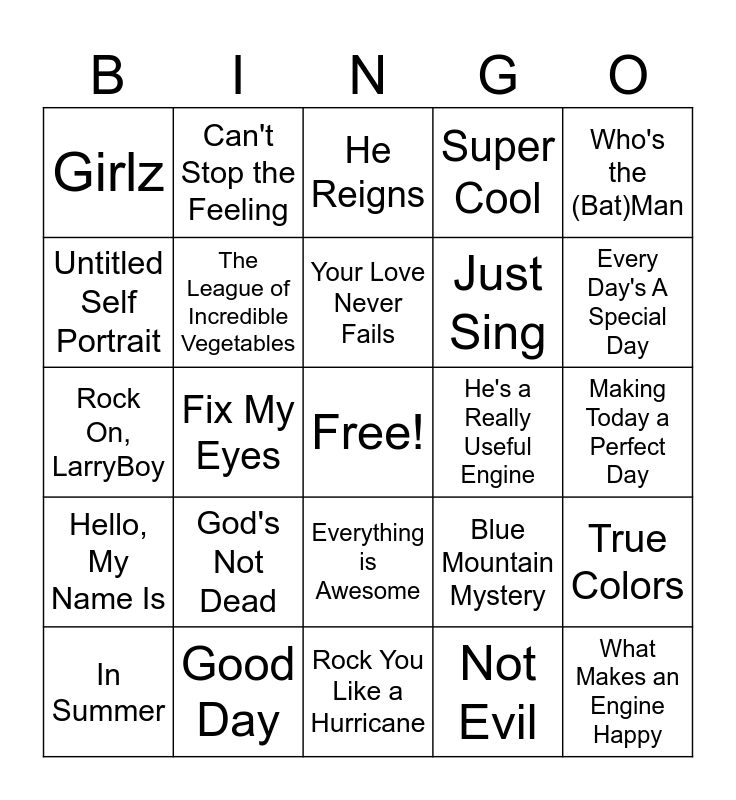 This bingo card has a free space and 24 words: God's Not Dead, Good Day, Your Love Never Fails, In Summer, Who's the (Bat)Man, Girlz, Untitled Self Portrait, Can't Stop the Feeling, He's a Really Useful Engine, Everything is Awesome, Just Sing, Rock On, LarryBoy, Blue Mountain Mystery, True Colors, The League of Incredible Vegetables, Not Evil, Making Today a Perfect Day, He Reigns, Every Day's A Special Day, Fix My Eyes, What Makes an Engine Happy, Hello, My Name Is, Super Cool and Rock You Like a Hurricane.
