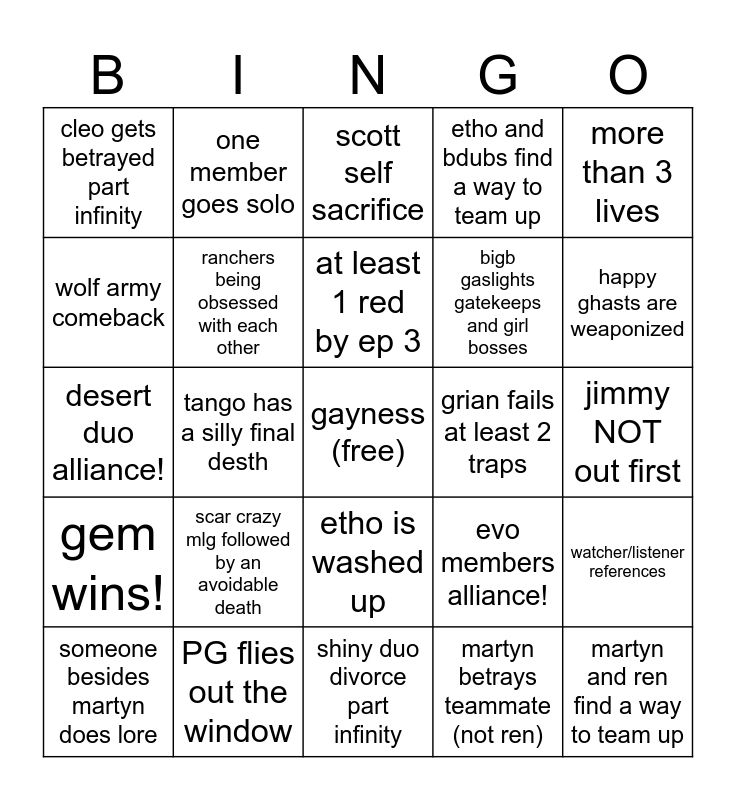 This bingo card has a free space and 24 words: scar crazy mlg followed by an avoidable death, PG flies out the window, at least 1 red by ep 3, someone besides martyn does lore, more than 3 lives, cleo gets betrayed part infinity, wolf army comeback, one member goes solo, grian fails at least 2 traps, etho is washed up, bigb gaslights gatekeeps and girl bosses, desert duo alliance!, evo members alliance!, watcher/listener references, ranchers being obsessed with each other, martyn betrays teammate (not ren), jimmy NOT out first, scott self sacrifice, happy ghasts are weaponized, tango has a silly final desth, martyn and ren find a way to team up, gem wins!, etho and bdubs find a way to team up and shiny duo divorce part infinity.