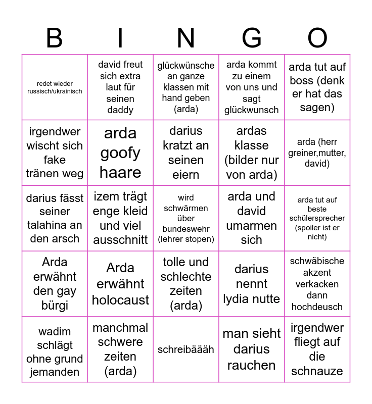 This bingo card has 25 words: Arda erwähnt holocaust, schreibäääh, darius kratzt an seinen eiern, wadim schlägt ohne grund jemanden, arda tut auf boss (denk er hat das sagen), redet wieder russisch/ukrainisch, irgendwer wischt sich fake tränen weg, david freut sich extra laut für seinen daddy, arda und david umarmen sich, tolle und schlechte zeiten (arda), ardas klasse (bilder nur von arda), darius fässt seiner talahina an den arsch, darius nennt lydia nutte, schwäbische akzent verkacken dann hochdeusch, arda goofy haare, irgendwer fliegt auf die schnauze, arda tut auf beste schülersprecher (spoiler ist er nicht), glückwünsche an ganze klassen mit hand geben (arda), arda (herr greiner,mutter, david), izem trägt enge kleid und viel ausschnitt, wird schwärmen über bundeswehr (lehrer stopen), manchmal schwere zeiten (arda), Arda erwähnt den gay bürgi, arda kommt zu einem von uns und sagt glückwunsch and man sieht darius rauchen.