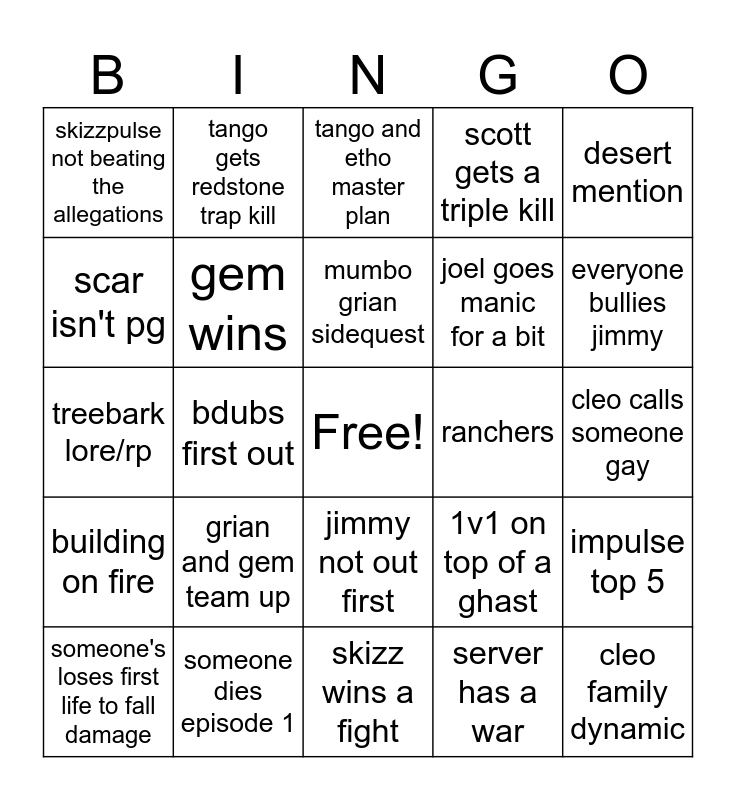 This bingo card has a free space and 24 words: grian and gem team up, someone dies episode 1, mumbo grian sidequest, someone's loses first life to fall damage, desert mention, skizzpulse not beating the allegations, scar isn't pg, tango gets redstone trap kill, ranchers, jimmy not out first, joel goes manic for a bit, treebark lore/rp, 1v1 on top of a ghast, impulse top 5, gem wins, server has a war, cleo calls someone gay, tango and etho master plan, everyone bullies jimmy, bdubs first out, cleo family dynamic, building on fire, scott gets a triple kill and skizz wins a fight.
