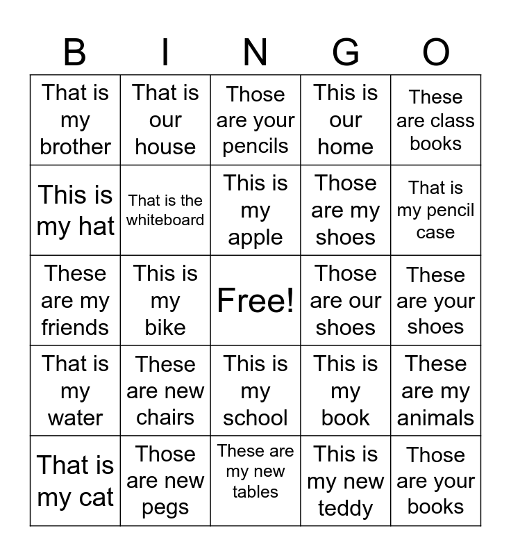 This bingo card has a free space and 24 words: These are new chairs, Those are new pegs, This is my apple, That is my cat, These are class books, That is my brother, This is my hat, That is our house, Those are our shoes, This is my school, Those are my shoes, These are my friends, This is my book, These are my animals, That is the whiteboard, This is my new teddy, These are your shoes, Those are your pencils, That is my pencil case, This is my bike, Those are your books, That is my water, This is our home and These are my new tables.