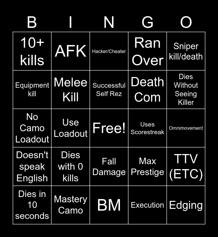 This bingo card has a free space and 24 words: Dies with 0 kills, Mastery Camo, Successful Self Rez, Dies in 10 seconds, Sniper kill/death, 10+ kills, Equipment kill, AFK, Uses Scorestreak, Fall Damage, Death Com, No Camo Loadout, Max Prestige, TTV (ETC), Melee Kill, Execution, Omnimovement, Hacker/Cheater, Dies Without Seeing Killer, Use Loadout, Edging, Doesn't speak English, Ran Over and BM.