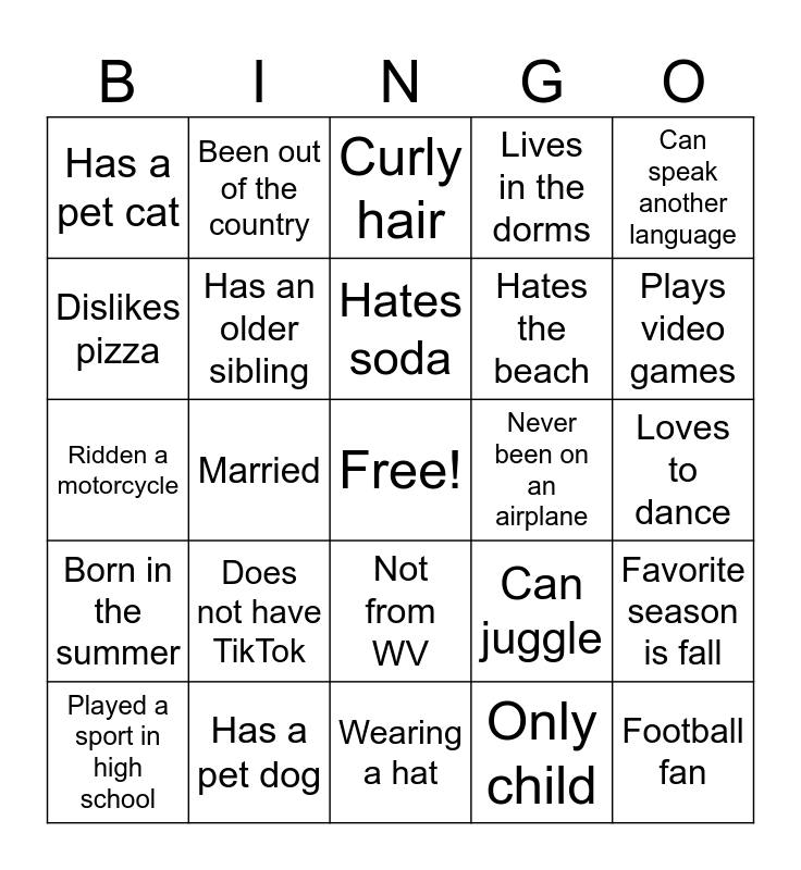 This bingo card has a free space and 34 words: Favorite color is green, Only child, Left-handed, Played in the band, Born in the summer, Has an older sibling, Can speak another language, Played a sport in high school, Been out of the country, Loves mac and cheese, Hates soda, Curly hair, Wearing Marshall shirt, Has more than 3 siblings, Never been on an airplane, Plays video games, Has a pet dog, Ridden a motorcycle, Does not have TikTok, Can juggle, Not from WV, Born in December, Has a pet cat, Loves to dance, Wearing a hat, Football fan, Lives in the dorms, Loves the beach, Hates the beach, Dislikes pizza, Seafood lover, Married, Favorite season is fall and Never been out of WV.