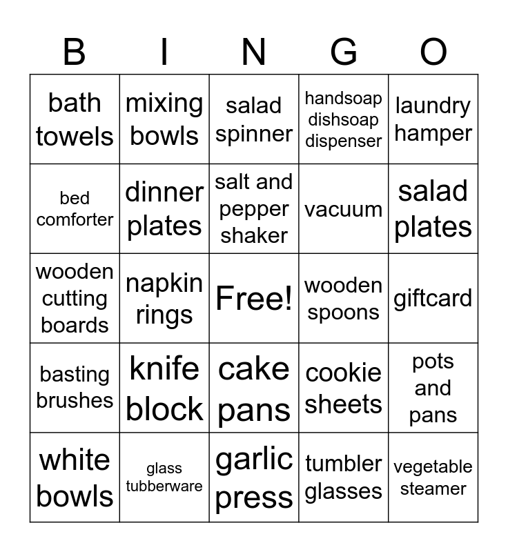 This bingo card has a free space and 24 words: knife block, glass tubberware, salt and pepper shaker, white bowls, laundry hamper, bath towels, bed comforter, mixing bowls, wooden spoons, cake pans, vacuum, wooden cutting boards, cookie sheets, pots and pans, dinner plates, tumbler glasses, giftcard, salad spinner, salad plates, napkin rings, vegetable steamer, basting brushes, handsoap dishsoap dispenser and garlic press.