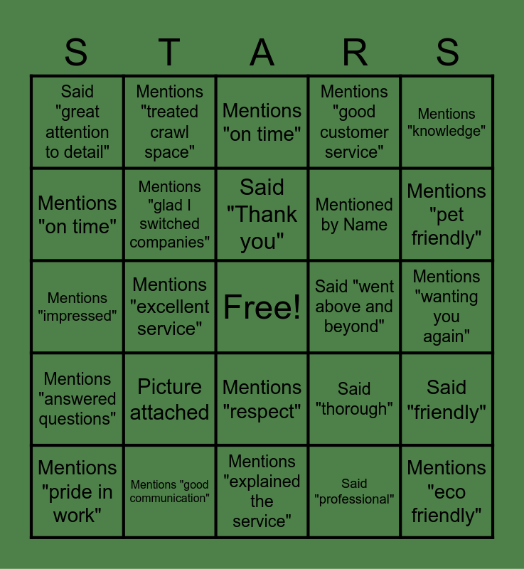 This bingo card has a free space and 24 words: Picture attached, Mentions "good communication", Said "Thank you", Mentions "pride in work", Mentions "knowledge", Said "great attention to detail", Mentions "on time", Mentions "treated crawl space", Said "went above and beyond", Mentions "respect", Mentioned by Name, Mentions "impressed", Said "thorough", Said "friendly", Mentions "glad I switched companies", Said "professional", Mentions "wanting you again", Mentions "on time", Mentions "pet friendly", Mentions "excellent service", Mentions "eco friendly", Mentions "answered questions", Mentions "good customer service" and Mentions "explained the service".