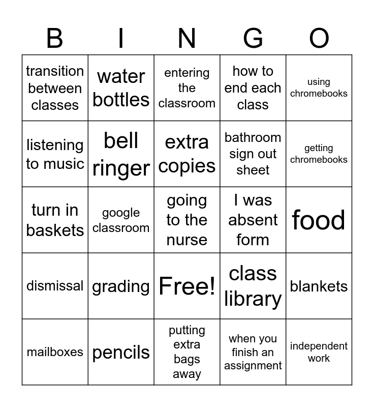 This bingo card has 26 words: Free!, when you finish an assignment, extra copies, pencils, using chromebooks, transition between classes, listening to music, water bottles, food, class library, bathroom sign out sheet, turn in baskets, blankets, mailboxes, google classroom, student supply cart, how to end each class, dismissal, entering the classroom, going to the nurse, getting chromebooks, putting extra bags away, I was absent form, grading, bell ringer and independent work.