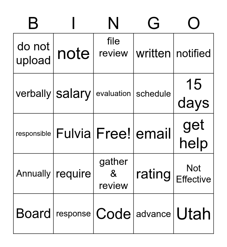 This bingo card has a free space and 24 words: require, response, evaluation, Board, notified, do not upload, verbally, note, email, gather & review, schedule, responsible, rating, Not Effective, salary, advance, get help, file review, 15 days, Fulvia, Utah, Annually, written and Code.