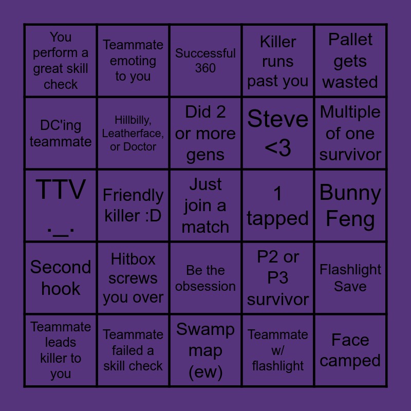 This bingo card has a free space and 24 words: Teammate leads killer to you, Hitbox screws you over, Did 2 or more gens, Teammate w/ flashlight, Pallet gets wasted, You perform a great skill check, Teammate emoting to you, Successful 360, 1 tapped, Bunny Feng, TTV ._., Hillbilly, Leatherface, or Doctor, P2 or P3 survivor, Flashlight Save, DC'ing teammate, Teammate failed a skill check, Swamp map (ew), Killer runs past you, Multiple of one survivor, Second hook, Friendly killer :D, Be the obsession, Steve <3 and Face camped.