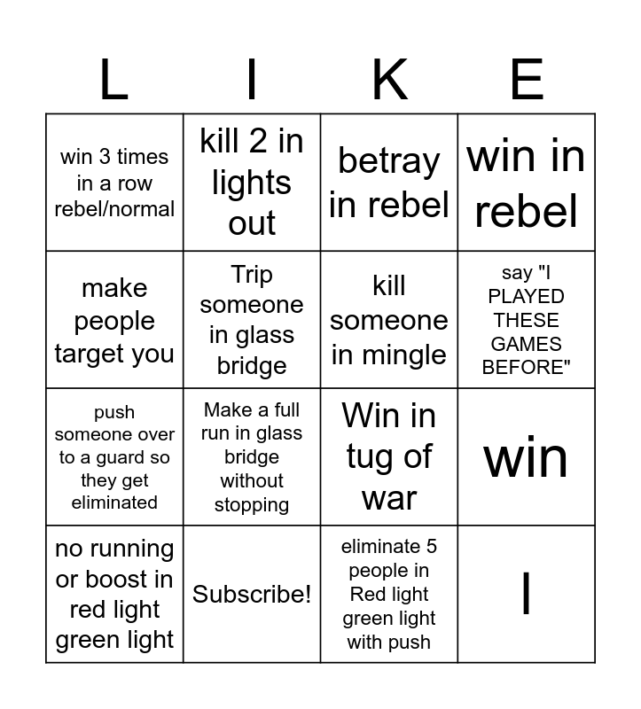This bingo card has 17 words: eliminate 5 people in Red light green light with push, no running or boost in red light green light, betray in rebel, win 3 times in a row rebel/normal, Make a full run in glass bridge without stopping, win in rebel, win, kill someone in mingle, say "I PLAYED THESE GAMES BEFORE", Trip someone in glass bridge, Subscribe!, Win in tug of war, make people target you, kill 2 in lights out, push someone over to a guard so they get eliminated, mona lisa and l.