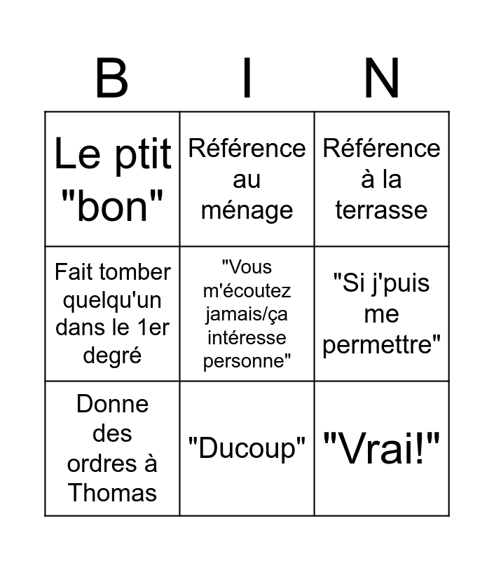 This bingo card has a free space and 8 words: "Si j'puis me permettre", Référence à la terrasse, Référence au ménage, Donne des ordres à Thomas, Le ptit "bon", "Vrai!", Fait tomber quelqu'un dans le 1er degré and "Ducoup".