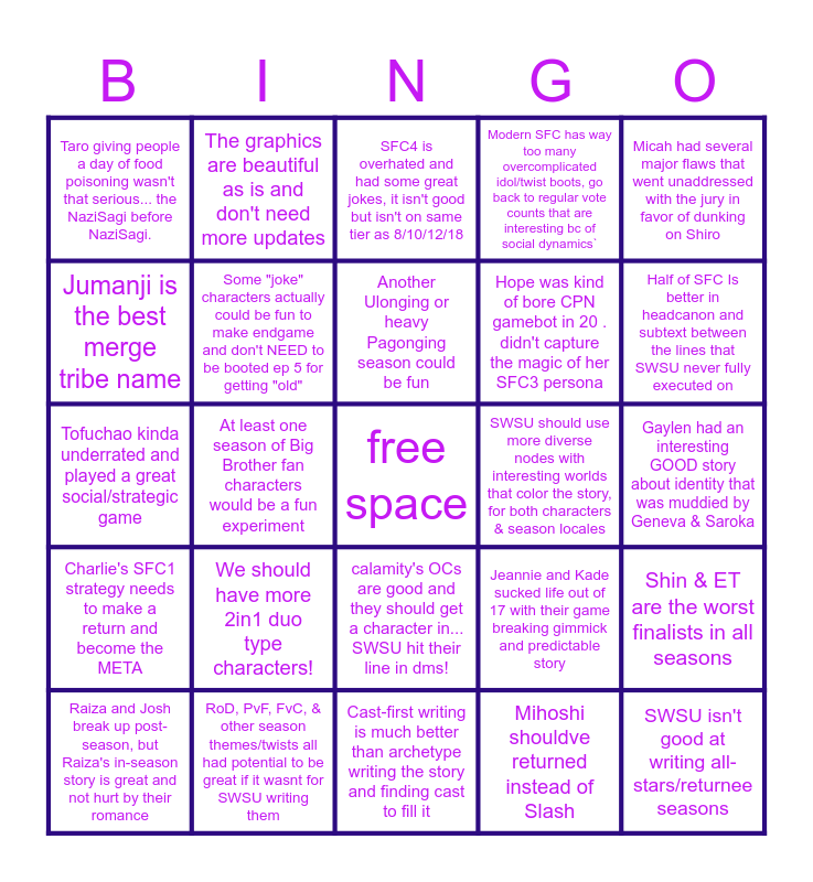 This bingo card has a free space and 24 words: We should have more 2in1 duo type characters!, RoD, PvF, FvC, & other season themes/twists all had potential to be great if it wasnt for SWSU writing them, Another Ulonging or heavy Pagonging season could be fun, Raiza and Josh break up post-season, but Raiza's in-season story is great and not hurt by their romance, Micah had several major flaws that went unaddressed with the jury in favor of dunking on Shiro, Taro giving people a day of food poisoning wasn't that serious... the NaziSagi before NaziSagi., Jumanji is the best merge tribe name, The graphics are beautiful as is and don't need more updates, SWSU should use more diverse nodes with interesting worlds that color the story, for both characters & season locales, calamity's OCs are good and they should get a character in... SWSU hit their line in dms!, Hope was kind of bore CPN gamebot in 20 . didn't capture the magic of her SFC3 persona, Tofuchao kinda underrated and played a great social/strategic game, Jeannie and Kade sucked life out of 17 with their game breaking gimmick and predictable story, Shin & ET are the worst finalists in all seasons, Some "joke" characters actually could be fun to make endgame and don't NEED to be booted ep 5 for getting "old", Mihoshi shouldve returned instead of Slash, Gaylen had an interesting GOOD story about identity that was muddied by Geneva & Saroka, SFC4 is overhated and had some great jokes, it isn't good but isn't on same tier as 8/10/12/18, Half of SFC Is better in headcanon and subtext between the lines that SWSU never fully executed on, At least one season of Big Brother fan characters would be a fun experiment, SWSU isn't good at writing all-stars/returnee seasons, Charlie's SFC1 strategy needs to make a return and become the META, Modern SFC has way too many overcomplicated idol/twist boots, go back to regular vote counts that are interesting bc of social dynamics` and Cast-first writing is much better than archetype writing the story and finding cast to fill it.