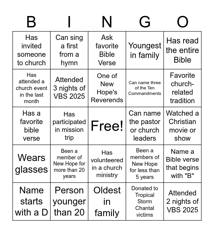 This bingo card has a free space and 24 words: Been a member of New Hope for more than 20 years, Person younger than 20, One of New Hope's Reverends, Name starts with a D, Has read the entire Bible, Has invited someone to church, Has attended a church event in the last month, Can sing a first from a hymn, Can name the pastor or church leaders, Has volunteered in a church ministry, Can name three of the Ten Commandments, Has a favorite bible verse, Been a members of New Hope for less than 5 years, Name a Bible verse that begins with "B", Attended 3 nights of VBS 2025, Donated to Tropical Storm Chantal victims, Watched a Christian movie or show, Ask favorite Bible Verse, Favorite church-related tradition, Has participated in mission trip, Attended 2 nights of VBS 2025, Wears glasses, Youngest in family and Oldest in family.