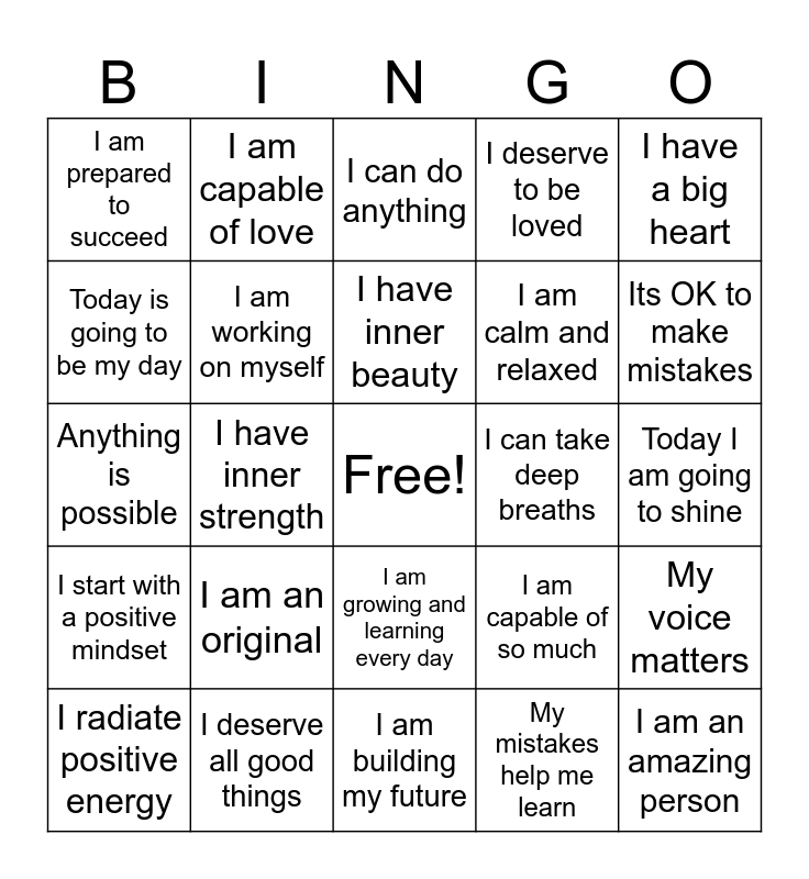This bingo card has a free space and 27 words: I am capable of so much, I am enough, I am calm and relaxed, I am building my future, Today is going to be my day, I can do anything, I am capable of love, I start with a positive mindset, I can take deep breaths, My voice matters, Anything is possible, I deserve to be loved, I radiate positive energy, I deserve all good things, Its OK to make mistakes, I am making the right choice, I am working on myself, I have inner beauty, I am an original, I am prepared to succeed, Today I am going to shine, My mistakes help me learn, I have inner strength, I am an amazing person, I am growing and learning every day, I have a big heart and I forgive myself for past mistakes.
