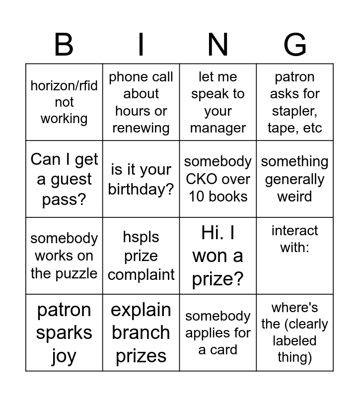 This bingo card has 16 words: explain branch prizes, interact with:, let me speak to your manager, horizon/rfid not working, somebody works on the puzzle, phone call about hours or renewing, Hi. I won a prize?, somebody applies for a card, Can I get a guest pass?, is it your birthday?, patron sparks joy, patron asks for stapler, tape, etc, hspls prize complaint, something generally weird, somebody CKO over 10 books and where's the (clearly labeled thing).