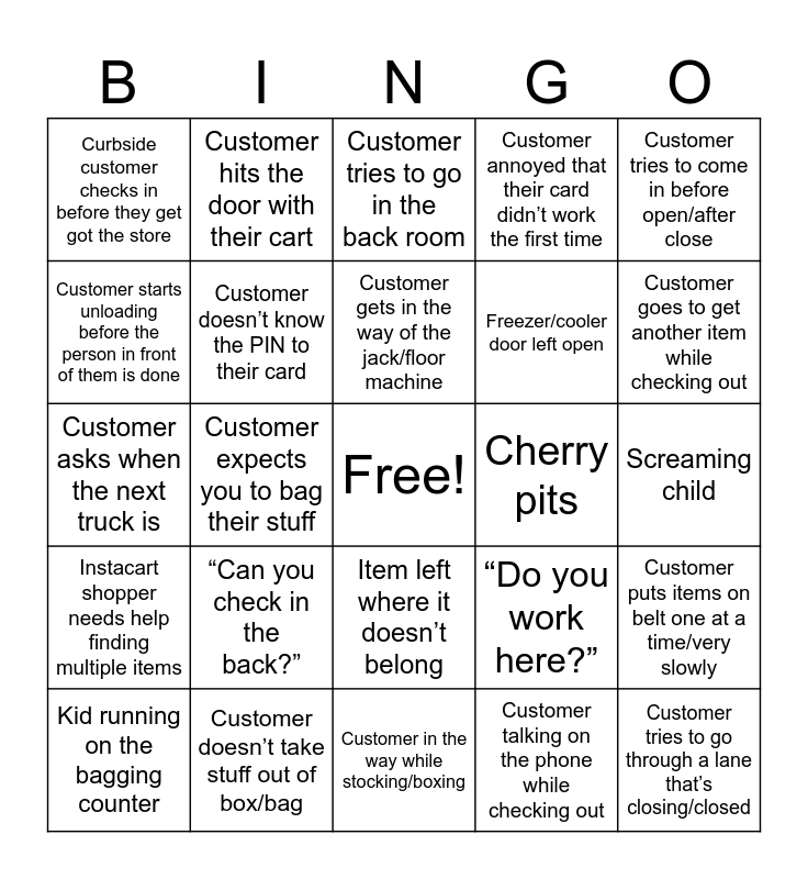 This bingo card has a free space and 24 words: “Can you check in the back?”, Customer doesn’t take stuff out of box/bag, Customer gets in the way of the jack/floor machine, Kid running on the bagging counter, Customer tries to come in before open/after close, Curbside customer checks in before they get got the store, Customer starts unloading before the person in front of them is done, Customer hits the door with their cart, Cherry pits, Item left where it doesn’t belong, Freezer/cooler door left open, Customer asks when the next truck is, “Do you work here?”, Customer puts items on belt one at a time/very slowly, Customer doesn’t know the PIN to their card, Customer talking on the phone while checking out, Screaming child, Customer tries to go in the back room, Customer goes to get another item while checking out, Customer expects you to bag their stuff, Customer tries to go through a lane that’s closing/closed, Instacart shopper needs help finding multiple items, Customer annoyed that their card didn’t work the first time and Customer in the way while stocking/boxing.