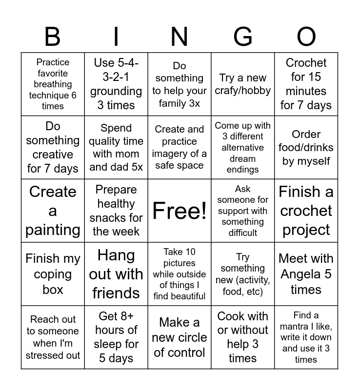This bingo card has a free space and 24 words: Hang out with friends, Get 8+ hours of sleep for 5 days, Create and practice imagery of a safe space, Reach out to someone when I'm stressed out, Crochet for 15 minutes for 7 days, Practice favorite breathing technique 6 times, Do something creative for 7 days, Use 5-4-3-2-1 grounding 3 times, Ask someone for support with something difficult, Take 10 pictures while outside of things I find beautiful, Come up with 3 different alternative dream endings, Create a painting, Try something new (activity, food, etc), Meet with Angela 5 times, Spend quality time with mom and dad 5x, Cook with or without help 3 times, Finish a crochet project, Do something to help your family 3x, Order food/drinks by myself, Prepare healthy snacks for the week, Find a mantra I like, write it down and use it 3 times, Finish my coping box, Try a new crafy/hobby and Make a new circle of control.