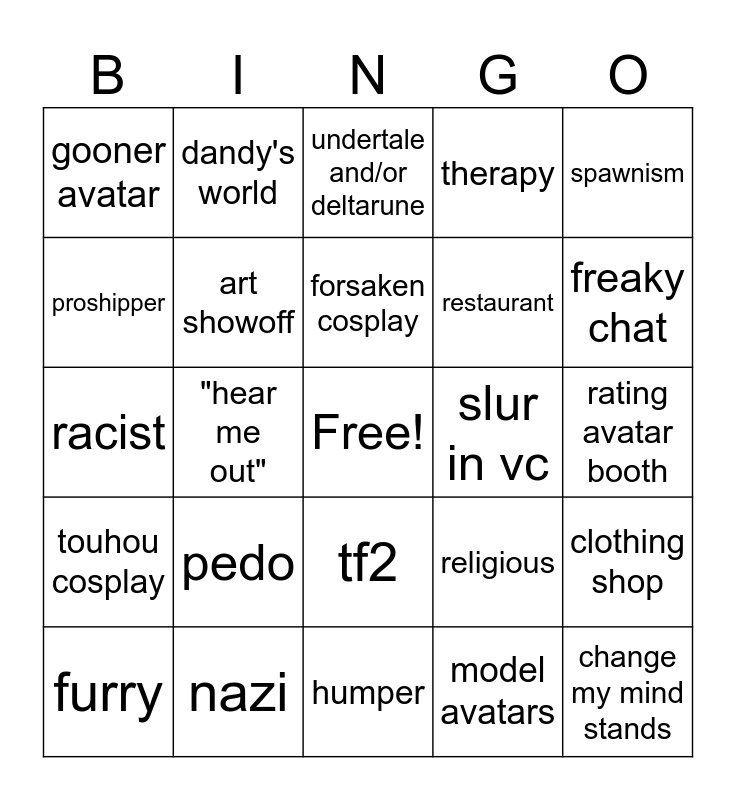 This bingo card has a free space and 24 words: pedo, nazi, forsaken cosplay, furry, spawnism, gooner avatar, proshipper, dandy's world, slur in vc, tf2, restaurant, racist, religious, clothing shop, art showoff, model avatars, rating avatar booth, undertale and/or deltarune, freaky chat, "hear me out", change my mind stands, touhou cosplay, therapy and humper.