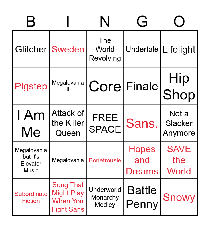 This bingo card has a free space and 24 words: Megalovania, Song That Might Play When You Fight Sans, Core, Subordinate Fiction, Lifelight, Glitcher, Pigstep, Sweden, Sans., Bonetrousle, Finale, I Am Me, Hopes and Dreams, SAVE the World, Megalovania II, Battle Penny, Not a Slacker Anymore, The World Revolving, Hip Shop, Attack of the Killer Queen, Snowy, Megalovania but It's Elevator Music, Undertale and Underworld Monarchy Medley.