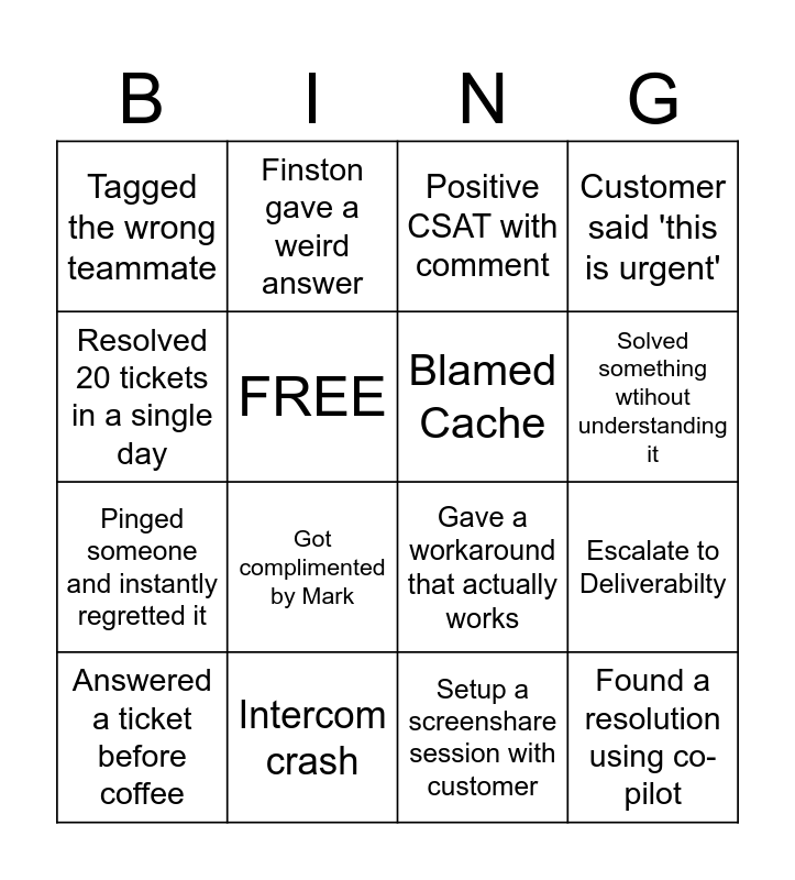 This bingo card has 16 words: Intercom crash, Escalate to Deliverabilty, Positive CSAT with comment, Tagged the wrong teammate, Pinged someone and instantly regretted it, Finston gave a weird answer, Gave a workaround that actually works, Setup a screenshare session with customer, Resolved 20 tickets in a single day, FREE, Answered a ticket before coffee, Customer said 'this is urgent', Got complimented by Mark, Solved something wtihout understanding it, Blamed Cache and Found a resolution using co-pilot.