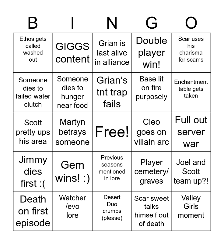 This bingo card has a free space and 24 words: Gem wins! :), Watcher /evo lore, Grian‘s tnt trap fails, Death on first episode, Scar uses his charisma for scams, Ethos gets called washed out, Someone dies to failed water clutch, GIGGS content, Cleo goes on villain arc, Previous seasons mentioned in lore, Base lit on fire purposely, Scott pretty ups his area, Player cemetery/ graves, Joel and Scott team up?!, Someone dies to hunger near food, Scar sweet talks himself out of death, Full out server war, Grian is last alive in alliance, Enchantment table gets taken, Martyn betrays someone, Valley Girls moment, Jimmy dies first :(, Double player win! and Desert Duo crumbs (please).