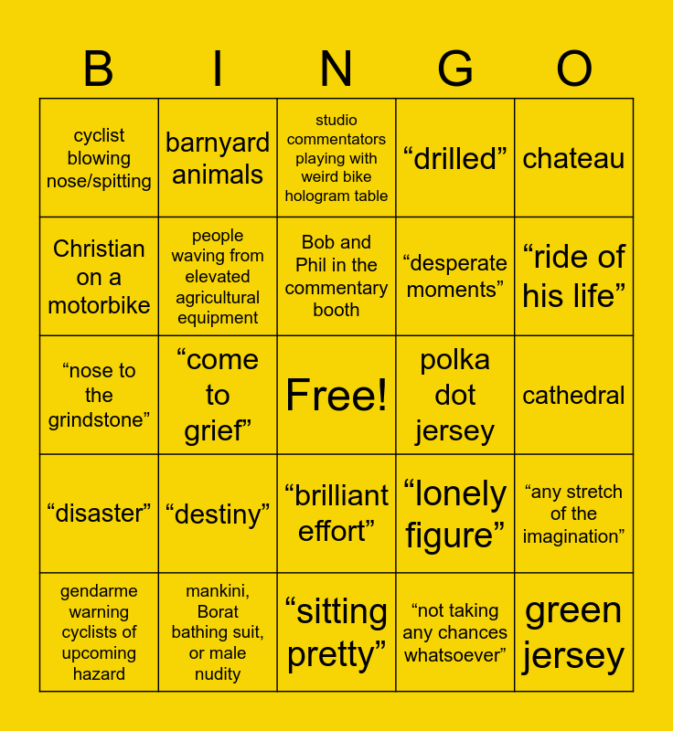 This bingo card has a free space and 65 words: “absolute disaster”, “absolutely flying”, “ahead of fastest expected time”, “any stretch of the imagination”, artistically arranged hay bales, “at this point in time”, barnyard animals, bike repaired from moving car, Bob and Phil in the commentary booth, Bob randomly yells, “brilliant effort”, “carnage”, cathedral, chateau, “cheeky move”, Christian on a motorbike, “come to grief”, cyclist blowing nose/spitting, cyclist taking a “natural break” (i.e., urinating), “desperate moments”, “destiny”, “disaster”, “drilled”, dropped water bottle, “elastic”, “full cry”, “the gap”, “going from strength to strength”, green jersey, helicopter, gendarme warning cyclists of upcoming hazard, hair poking out of the top of rider’s helmet, injury treated from moving car, “light a fire under him”, “lonely figure”, mankini, Borat bathing suit, or male nudity, “never put a pedal wrong”, “nose to the grindstone”, “not taking any chances whatsoever”, “nowadays”, people waving from elevated agricultural equipment, Phil misidentifies a rider, polka dot jersey, “poor old _____”, “psychological blow”, “put the hammer down”, “ride of his life”, rider deviating from his line (on a sprint), rider drafting through cars, rider holding onto a moving car, rider taking food or water from a moving car, rider with tongue hanging out, rotating groups of similarly dressed people, “sitting pretty”, “sketchy”, spectator in inflatable costume, Steve Porino interviews a random spectator, studio commentators playing with weird bike hologram table, traffic/road furniture, “we have no control over the cameras”, white jersey, yellow jersey, yo-yoing, “you can’t win the Tour today, but you can lose it” and team bus.
