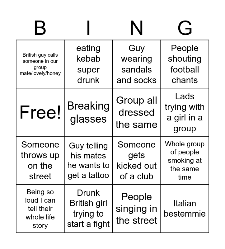 This bingo card has 16 words: Drunk British girl trying to start a fight, Whole group of people smoking at the same time, Guy wearing sandals and socks, British guy calls someone in our group mate/lovely/honey, Someone throws up on the street, eating kebab super drunk, Someone gets kicked out of a club, People singing in the street, Free!, Breaking glasses, Being so loud I can tell their whole life story, People shouting football chants, Guy telling his mates he wants to get a tattoo, Lads trying with a girl in a group, Group all dressed the same and Italian bestemmie.