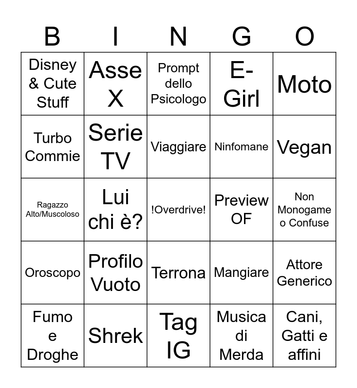 This bingo card has a free space and 24 words: Profilo Vuoto, Shrek, Viaggiare, Fumo e Droghe, Moto, Disney & Cute Stuff, Turbo Commie, Asse X, Preview OF, Terrona, Ninfomane, Ragazzo Alto/Muscoloso, Mangiare, Attore Generico, Serie TV, Musica di Merda, Non Monogame o Confuse, Prompt dello Psicologo, Vegan, Lui chi è?, Cani, Gatti e affini, Oroscopo, E-Girl and Tag IG.