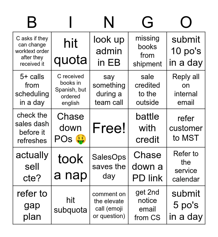 This bingo card has a free space and 25 words: took a nap, comment on the elevate call (emoji or question), say something during a team call, refer to gap plan, submit 10 po's in a day, C asks if they can change worktext order after they received it, 5+ calls from scheduling in a day, hit quota, battle with credit, SalesOps saves the day, sale credited to the outside, check the sales dash before it refreshes, Chase down a PD link, Refer to the service calendar, C received books in Spanish, but ordered english, refer myself to MST, refer customer to MST, look up admin in EB, Reply all on internal email, Chase down POs 🤑, submit 5 po's in a day, hit subquota, actually sell cte?, missing books from shipment and get 2nd notice email from CS.