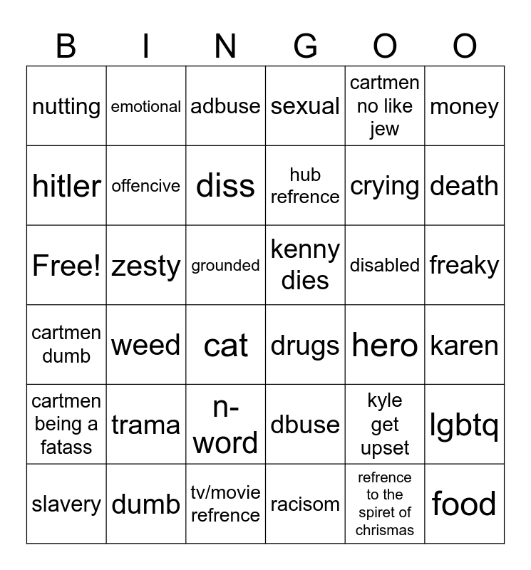 This bingo card has 36 words: dbuse, n-word, racisom, hitler, cartmen dumb, kenny dies, offencive, tv/movie refrence, cartmen no like jew, kyle get upset, death, sexual, lgbtq, zesty, hub refrence, nutting, cartmen being a fatass, disabled, Free!, adbuse, grounded, weed, drugs, cat, hero, emotional, crying, dumb, diss, money, food, slavery, karen, freaky, trama and refrence to the spiret of chrismas.