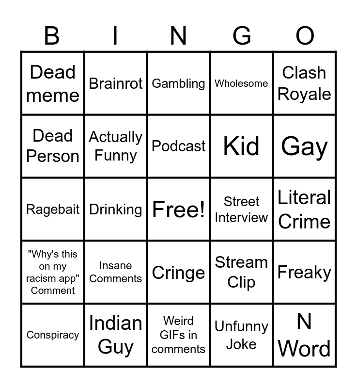 This bingo card has a free space and 24 words: Insane Comments, Indian Guy, Podcast, Conspiracy, Clash Royale, Dead meme, Dead Person, Brainrot, Street Interview, Cringe, Kid, Ragebait, Stream Clip, Freaky, Actually Funny, Unfunny Joke, Literal Crime, Gambling, Gay, Drinking, N Word, "Why's this on my racism app" Comment, Wholesome and Weird GIFs in comments.