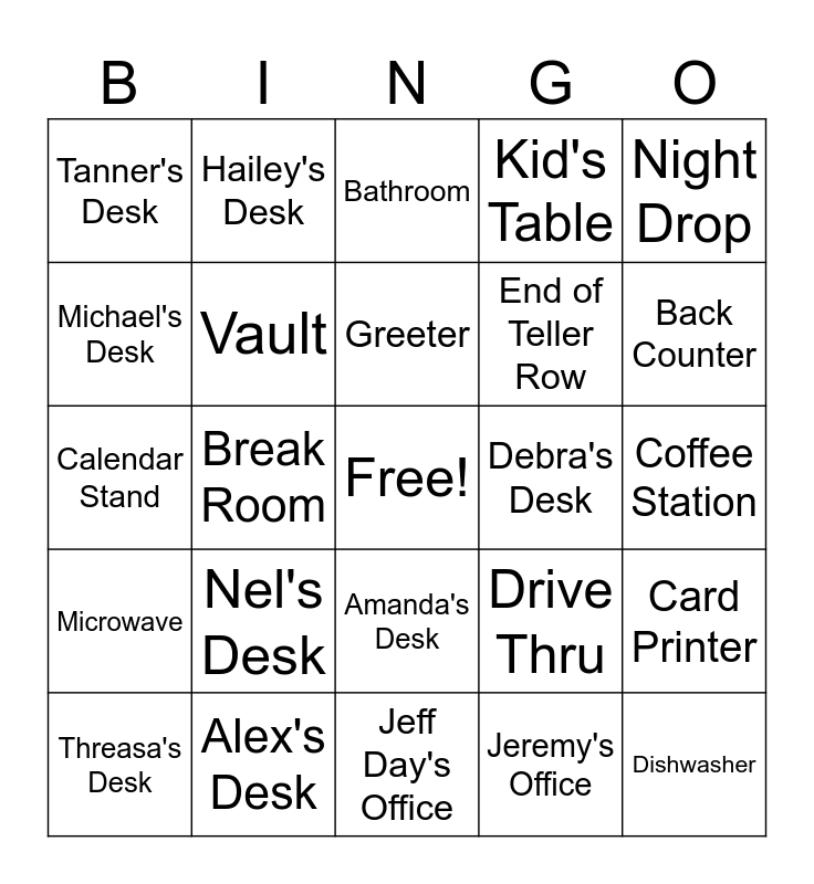 This bingo card has a free space and 24 words: Nel's Desk, Alex's Desk, Greeter, Threasa's Desk, Night Drop, Tanner's Desk, Michael's Desk, Hailey's Desk, Debra's Desk, Amanda's Desk, End of Teller Row, Calendar Stand, Drive Thru, Card Printer, Vault, Jeremy's Office, Coffee Station, Bathroom, Back Counter, Break Room, Dishwasher, Microwave, Kid's Table and Jeff Day's Office.
