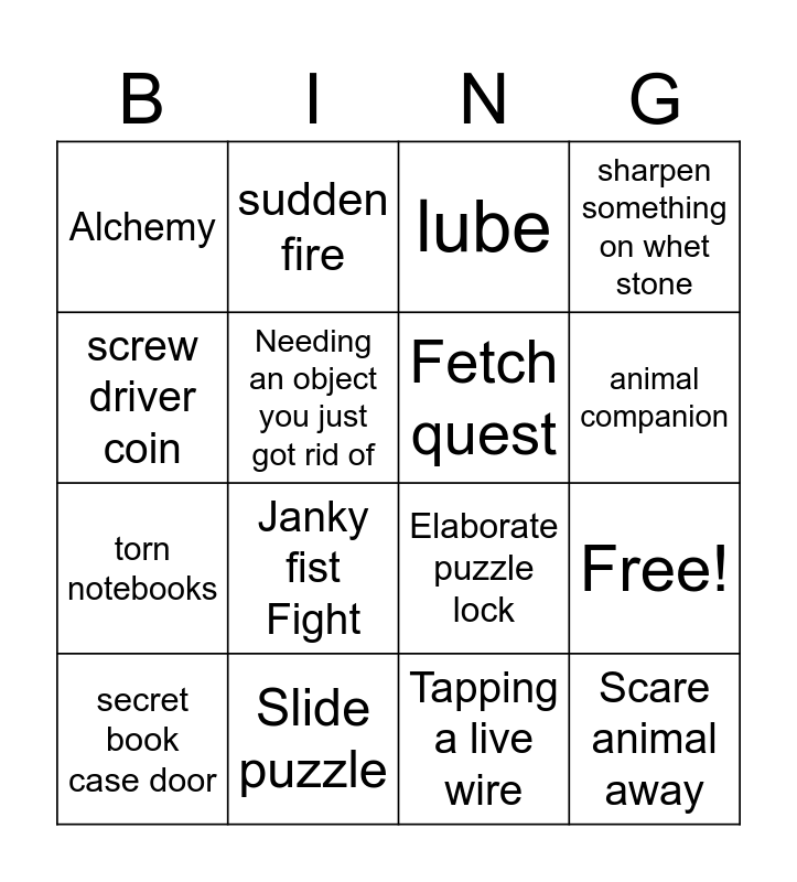 This bingo card has 20 words: Free!, Head injury, lube, Rust remover, secret book case door, screw driver coin, Slide puzzle, Alchemy, torn notebooks, sudden fire, Janky fist Fight, Elaborate puzzle lock, Needing an object you just got rid of, Scare animal away, Fetch quest, magic power, animal companion, sharpen something on whet stone, Tapping a live wire and fixing a generator.