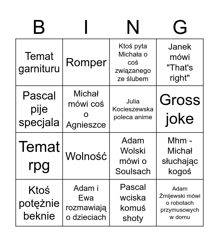 This bingo card has 32 words: Puk, puk, Przegrałem, Mhm - Michał słuchając kogoś, Ktoś rozlewa drinka, Adam Żmijewski mówi o robotach przymusowych w domu, Julia Kocieszewska poleca anime, Pascal pije specjala, Adam Żmijewski opowiada self - depracating joke, Romper, Ktoś pyta Różę o tatuaże, Gross joke, Ktoś pyta Michała o coś związanego ze ślubem, Ktoś opowiada dziwną historię o Michale, Adam Wolski mówi o filozofii/religii, Adam i Ewa rozmawiają o dzieciach, Sonia mówi o koncercie, Ewa opowiada o książkach fantasy new adult, Adam Wolski mówi o Soulsach, Michał mówi "yeeee", Michał mówi "yoooo", Krzysiu zaprasza kogoś na ściankę, Michał mówi o wyższości Pf2 nad D&D, Pascal wciska komuś shoty, Michał jest kochanym skarbeńkiem, Ktoś potężnie beknie, Janek mówi "That's right", Temat rpg, Michał mówi coś o Agnieszce, Temat garnituru, Narzekanie na studia, Janek powie "ja tu nikogo nie znam" and Wolność.