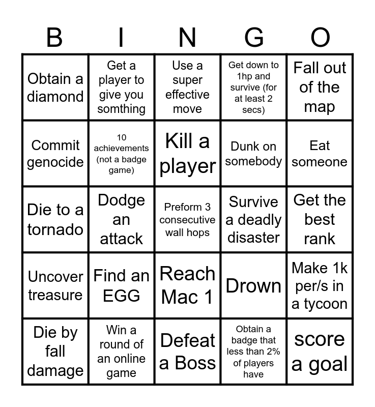 This bingo card has 25 words: Find an EGG, Defeat a Boss, Kill a player, Die by fall damage, Fall out of the map, Obtain a diamond, Commit genocide, Get a player to give you somthing, Survive a deadly disaster, Reach Mac 1, Dunk on somebody, Die to a tornado, Drown, Make 1k per/s in a tycoon, 10 achievements (not a badge game), score a goal, Get the best rank, Use a super effective move, Eat someone, Dodge an attack, Preform 3 consecutive wall hops, Win a round of an online game, Uncover treasure, Get down to 1hp and survive (for at least 2 secs) and Obtain a badge that less than 2% of players have.