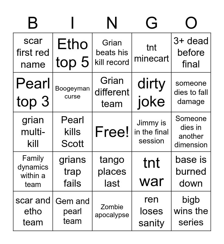 This bingo card has a free space and 24 words: grians trap fails, Gem and pearl team, Grian different team, scar and etho team, 3+ dead before final, scar first red name, Pearl top 3, Etho top 5, Jimmy is in the final session, tango places last, dirty joke, grian multi- kill, tnt war, base is burned down, Boogeyman curse, ren loses sanity, Someone dies in another dimension, Grian beats his kill record, someone dies to fall damage, Pearl kills Scott, bigb wins the series, Family dynamics within a team, tnt minecart and Zombie apocalypse.