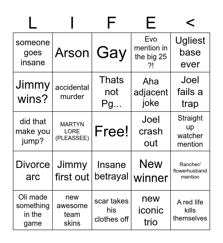 This bingo card has a free space and 24 words: Jimmy first out, new awesome team skins, Thats not Pg..., Oli made something in the game, Ugliest base ever, someone goes insane, Jimmy wins?, Arson, Joel crash out, Insane betrayal, Aha adjacent joke, did that make you jump?, New winner, Rancher/ flowerhusband mention, accidental murder, new iconic trio, Straight up watcher mention, Gay, Joel fails a trap, MARTYN LORE (PLEASSEE), A red life kills themselves, Divorce arc, Evo mention in the big 25 ?! and scar takes his clothes off.