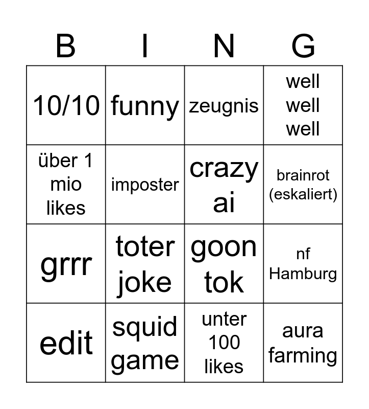This bingo card has 16 words: squid game, nf Hamburg, zeugnis, 10/10, grrr, funny, goon tok, unter 100 likes, über 1 mio likes, imposter, edit, well well well, toter joke, brainrot (eskaliert), crazy ai and aura farming.