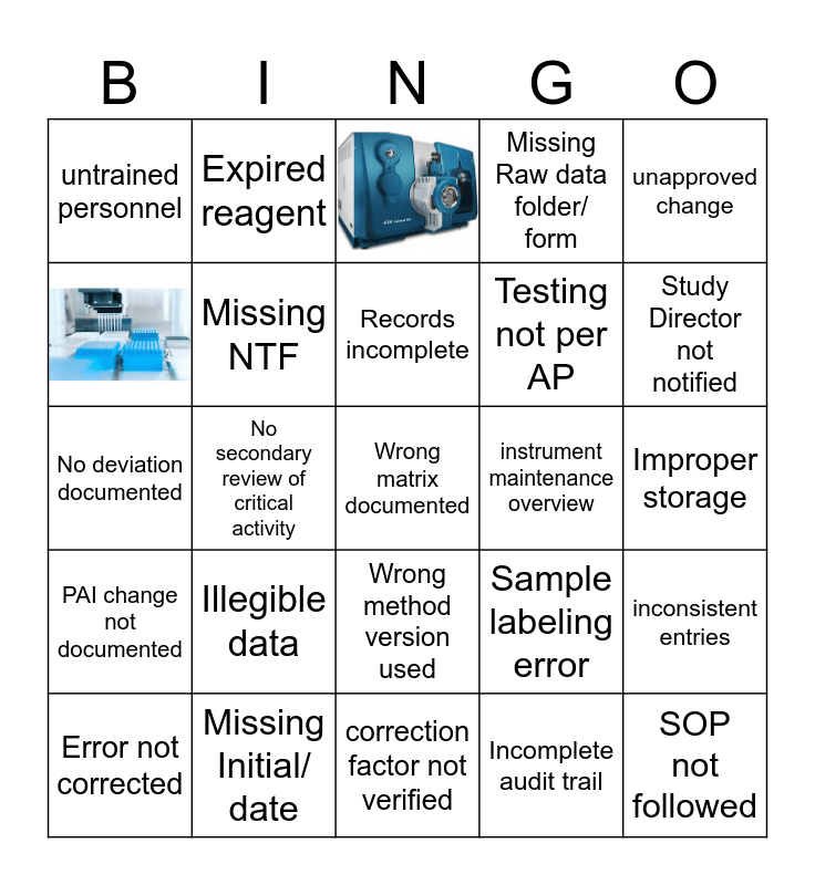 This bingo card has 2 images, a free space and 22 words: Illegible data, Missing Initial/ date, Records incomplete, Error not corrected, unapproved change, untrained personnel, Expired reagent, instrument maintenance overview, Wrong method version used, Testing not per AP, No deviation documented, Sample labeling error, inconsistent entries, Missing NTF, Incomplete audit trail, Improper storage, Study Director not notified, No secondary review of critical activity, SOP not followed, PAI change not documented, Missing Raw data folder/ form and correction factor not verified.