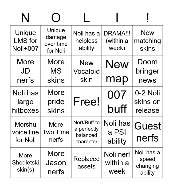 This bingo card has a free space and 24 words: More Two Time nerfs, More Jason nerfs, New Vocaloid skin, More Shedletski skin(s), New matching skins, Unique LMS for Noli+007, More JD nerfs, Unique damage over time for Noli, 007 buff, Nerf/Buff to a perfectly balanced character, New map, Noli has large hitboxes, Noli has a PSI ability, Guest nerfs, More MS skins, Noli nerf within a week, 0-2 Noli skins on release, Noli has a helpless ability, Doom bringer news, More pride skins, Noli has a speed changing ability, Morshu voice line for Noli, DRAMA!!! (within a week) and Replaced assets.